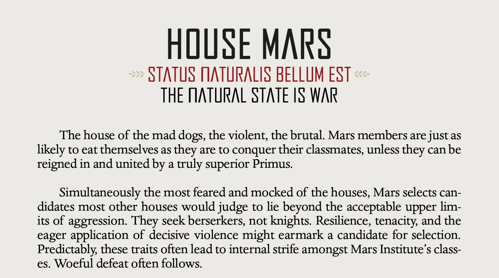 For the first time ever, Pierce Brown has written a full suite of Institute House Dossiers featuring exclusive content about the history, philosophy and personality traits central to all 13 Houses at the Institute on Mars.