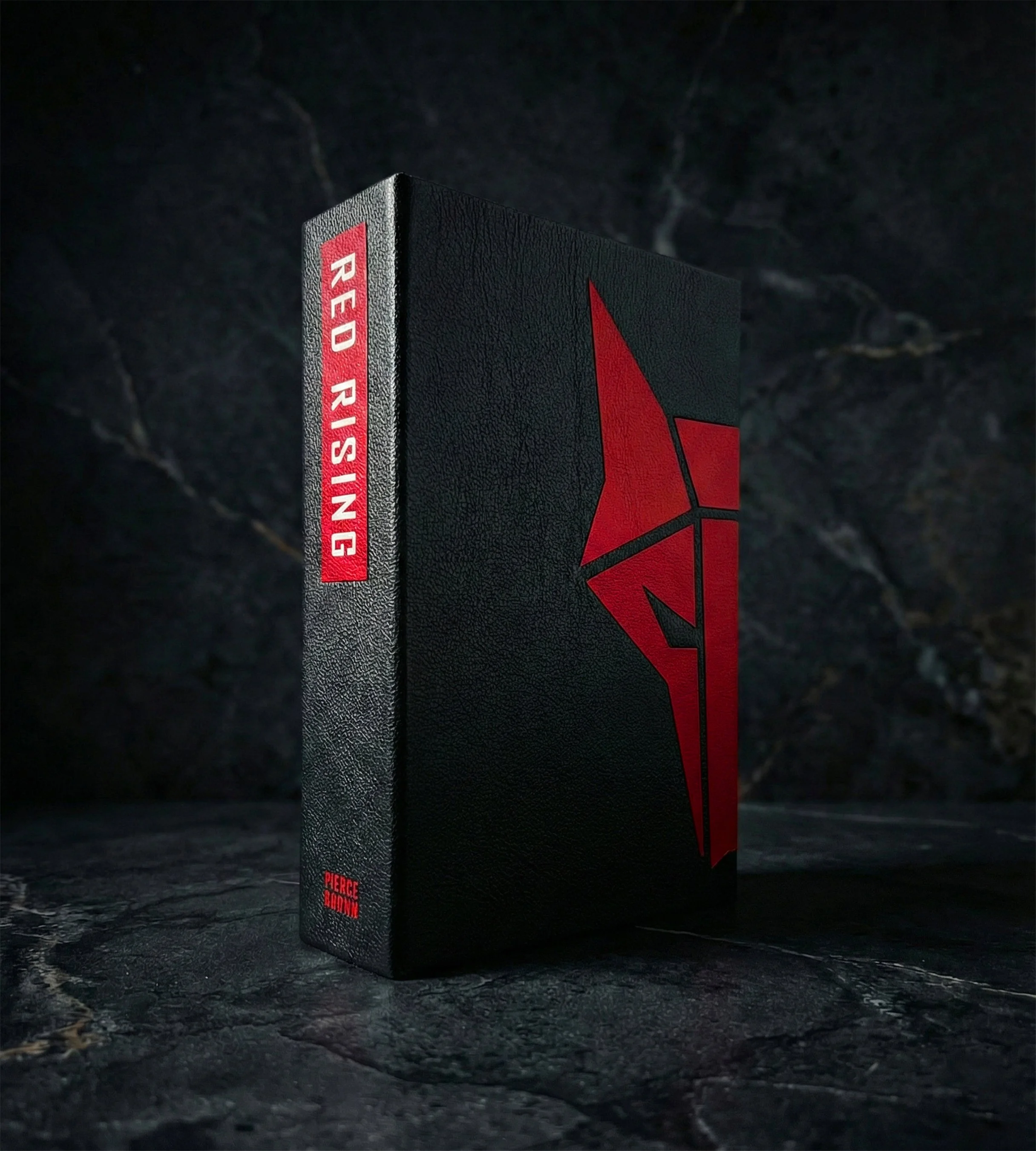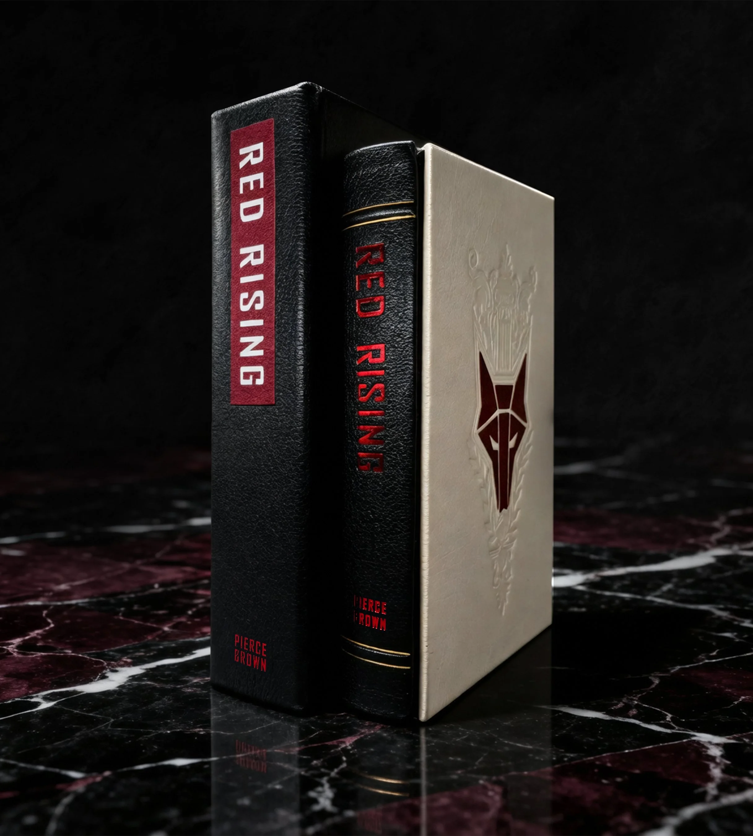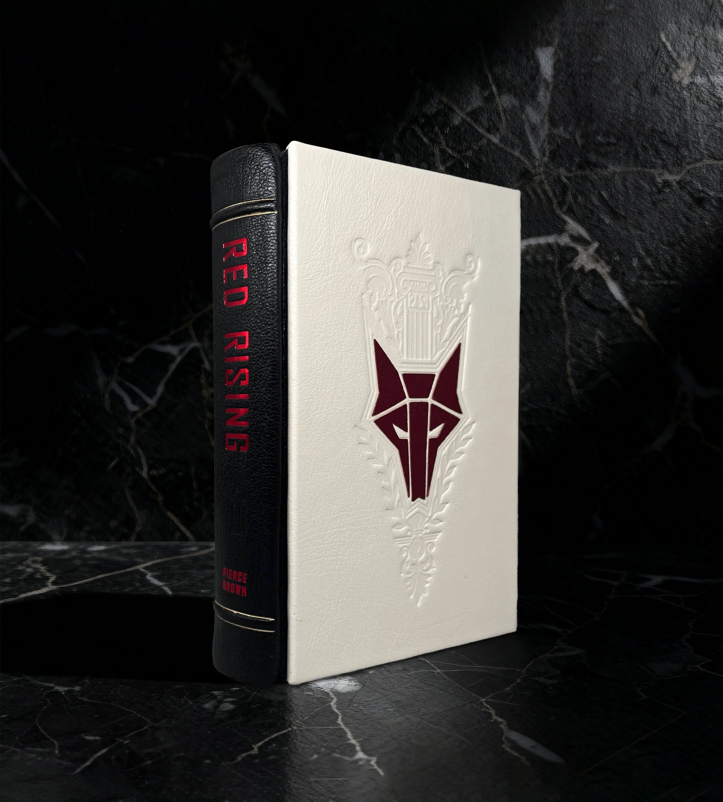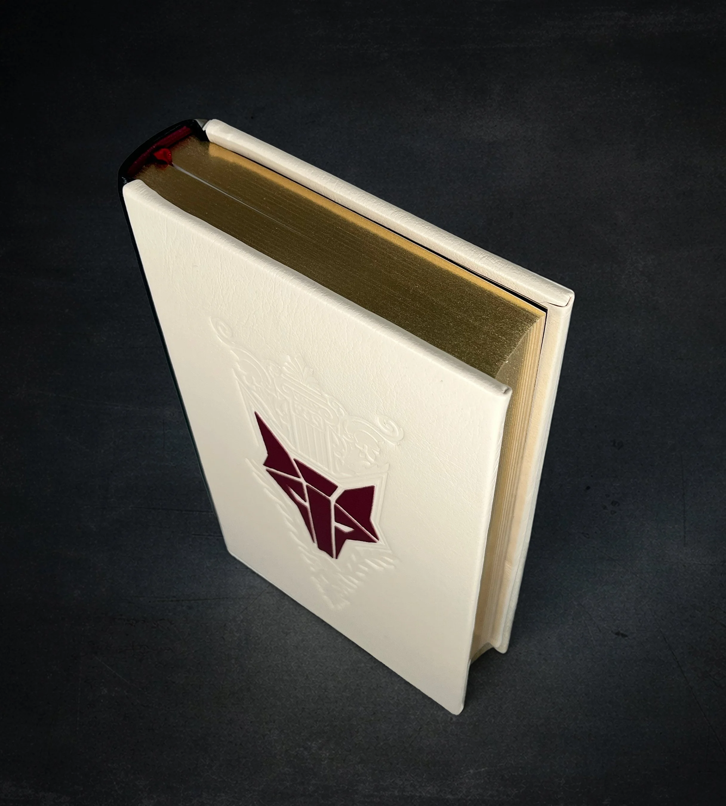 How do you top the Numbered Edition? You produce a Lettered Edition, and for the first time this is limited to 52 copies (rather than 26). This is the tier that screams high-end master-bookbinding. It does of course come with all the interior artwork of the other tiers, but on an even better quality of mouldmade paper. It’s housed in a full leather solander clamshell traycase using the finest materials. The book itself has been “bradel bound”, a particularly beautiful and delicate way to attach the spine material to the books boards. The front board has been subtly blindstamped with a custom Red Rising inspired design with 6 pieces of Antique Burgandy leather onlay of the Howler sigil.