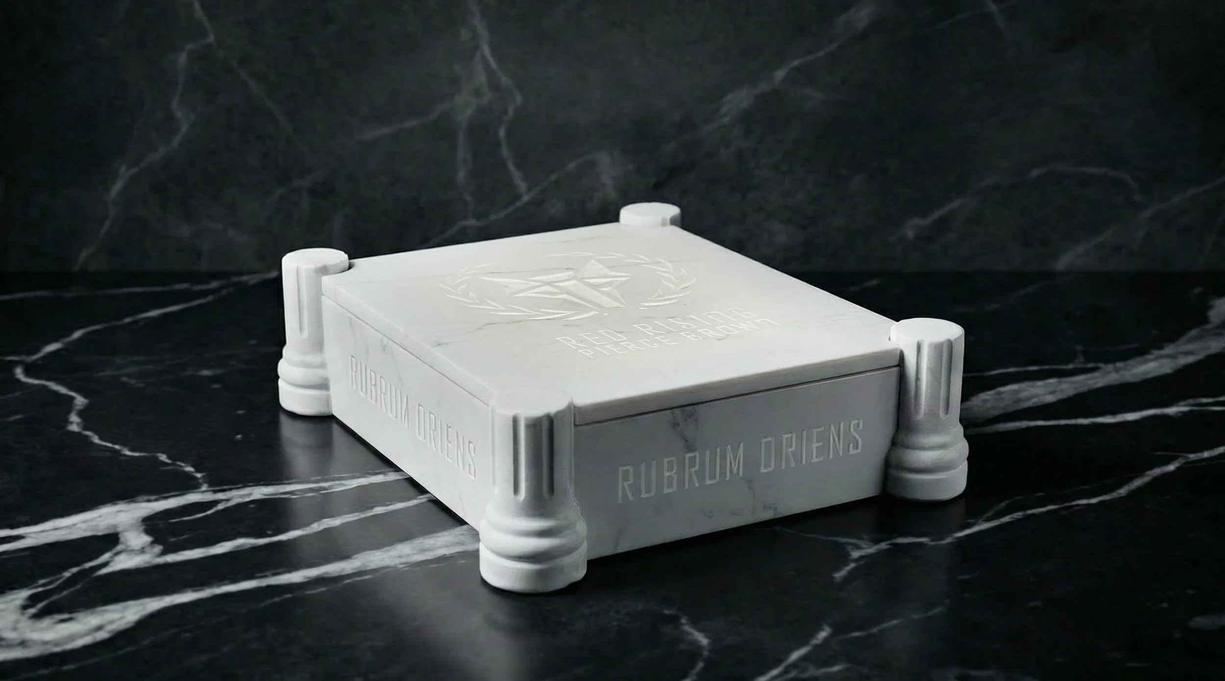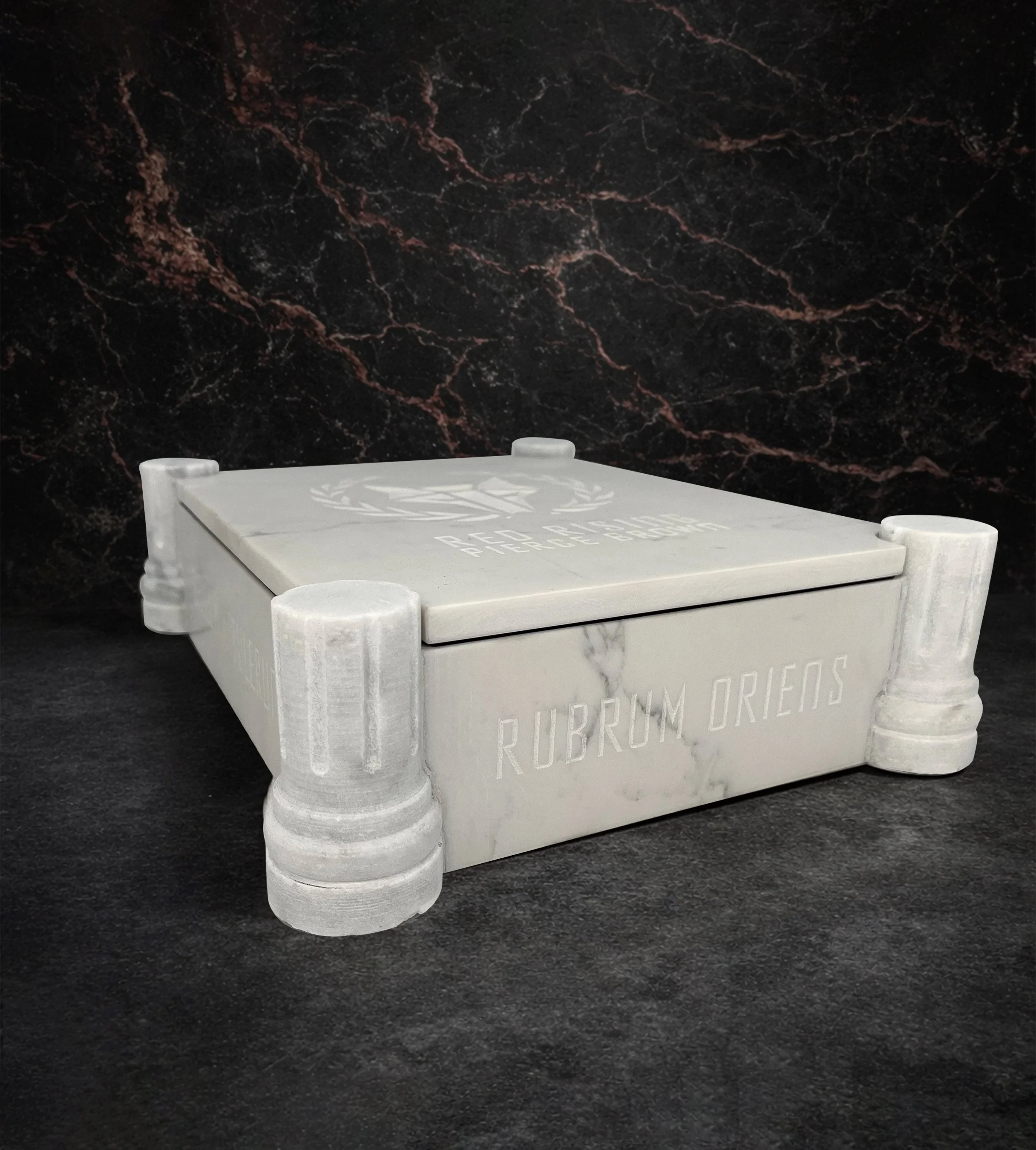 Housed in a handmade marble box by master stonecarver Nick Roberson and lined by Ludlow Bookbinders. The four pillar design as well as the Howler sigil and text on the lid has been hand carved by Roberson himself as well as the Howler sigil and text on the lid. Across all four sides of the box is hand carved lettering in Latin which translates to “I would have come in peace, but my enemies brought me war”.