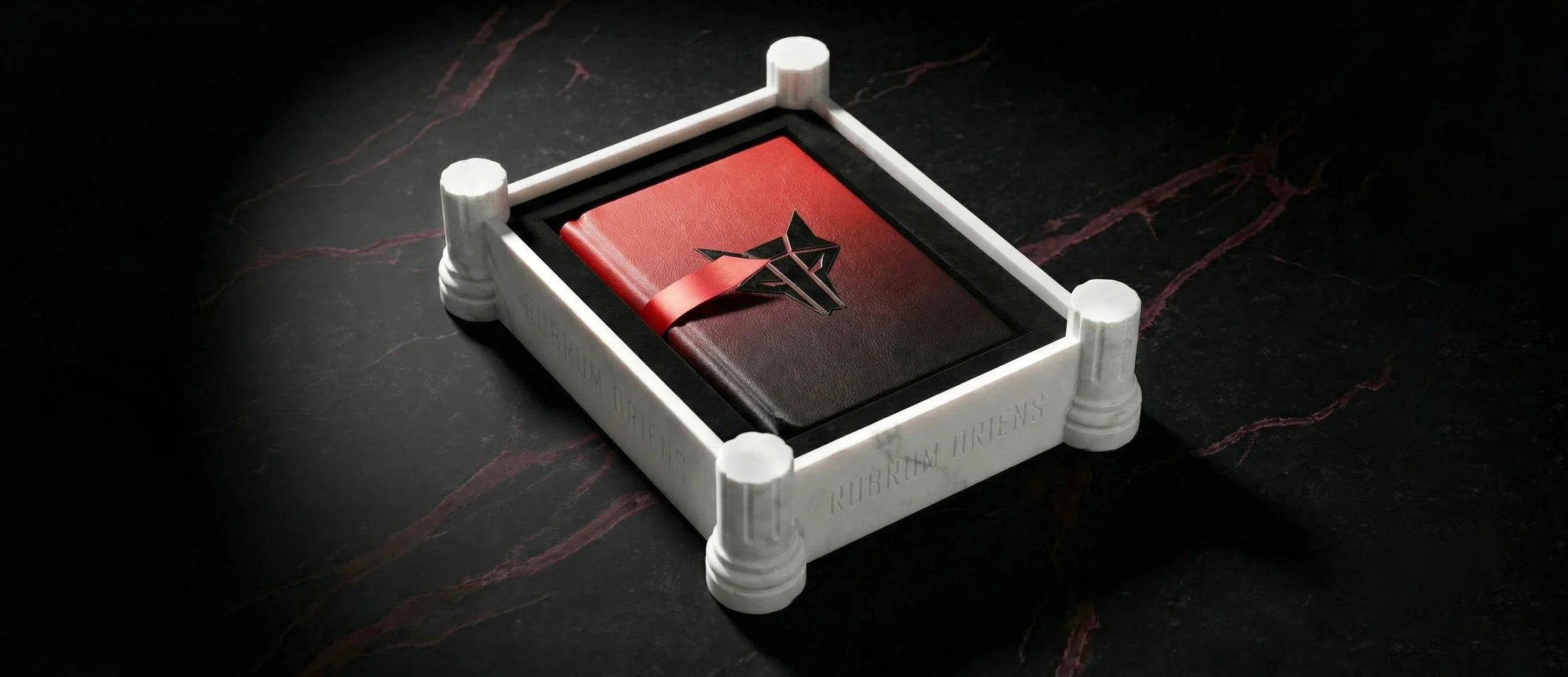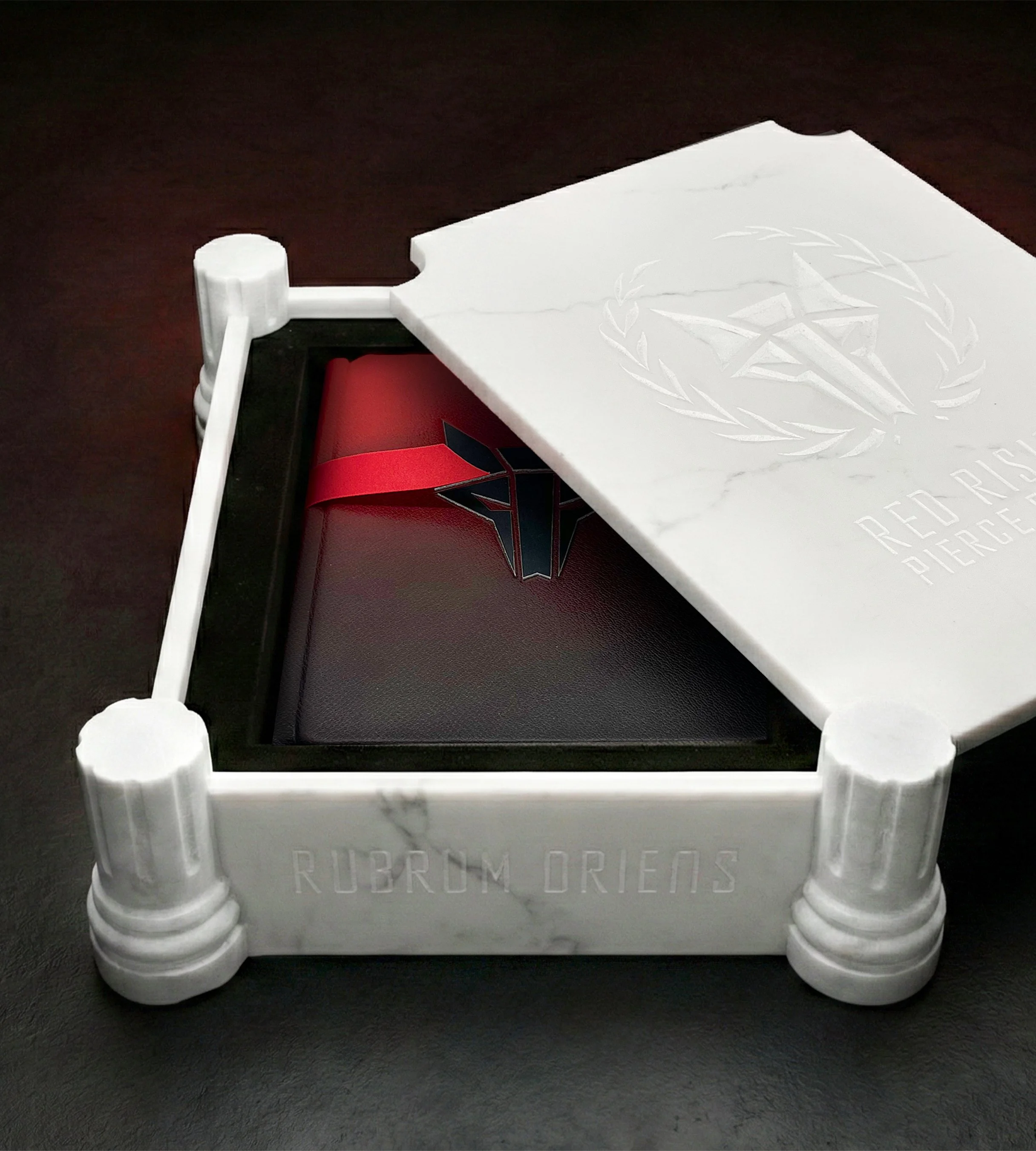 This is the ultimate, the insane, the creatively unhinged edition. When you get an opportunity to create a handmade marble case with hand-lathed pillars, I’m afraid you have to take it. This edition was made simply because we had to do it. Almost certainly a terrible financial decision on our part due to the sheer cost of so much world-class artistry and craft, but we did it anyway. Yes, the box has been hand crafted and carved by master stonemason Nick Roberson and lined by Ludlow Bookbinders. The book itself is hand painted from red to black and features spine text and Howler sigil cut out of black steel. The edges are hand gilded in copper and distressed with Verdigris. Oh yeah, and the paper is all handmade by the last remaining paper mill operating in the UK, effectively revitalising a near dead artform. The rest… Well, see for yourself.